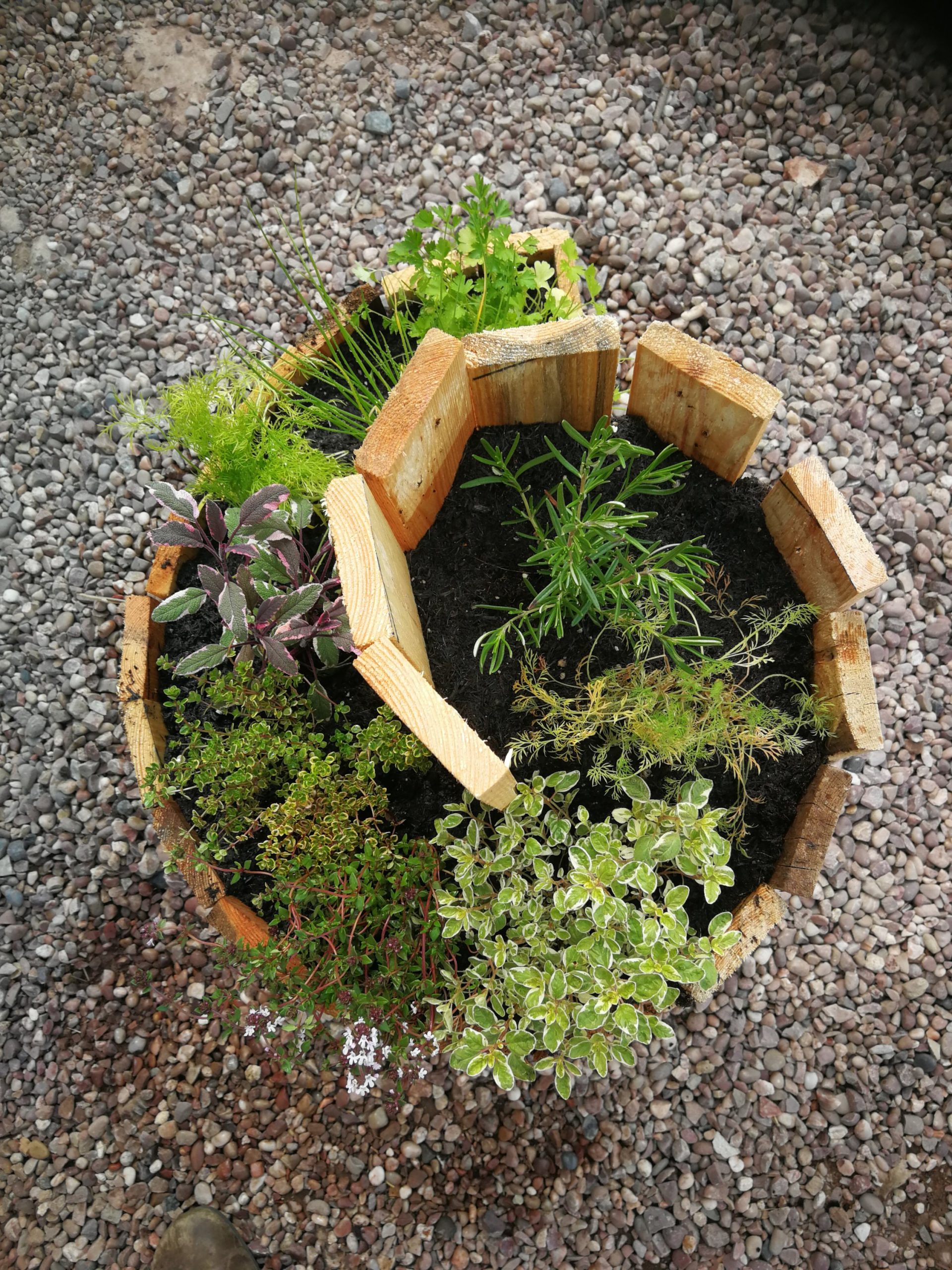 Our sensory garden needs a herb spiral, no question, but our wheelchair user has limited mobility. Her chair needs to get close to objects and at her height, for her to access it.